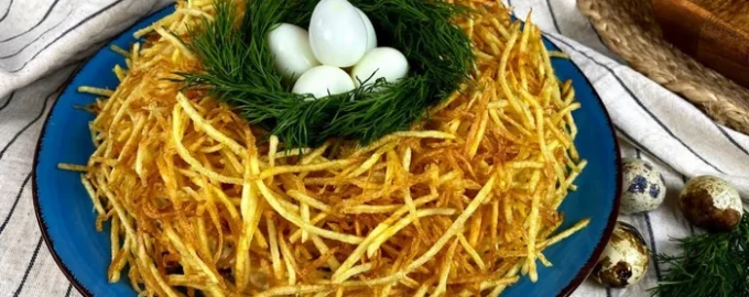 Ta lepa in okusna solata je kot nalašč za praznično mizo. Izvirna solata “Gnezdo jerebice” ali “Prepeličje gnezdo”